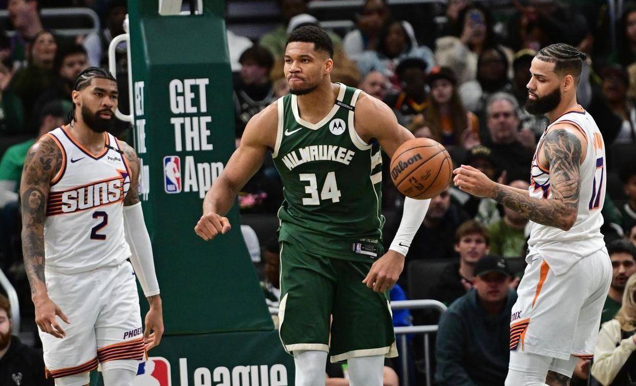 字母哥晃飞德罗赞,隔扣武切维奇篮下1V4暴扣,自抛自抢,双手挂框扣篮太霸气 第一节,字母哥摘板反击上篮打进,紧接着转换进攻的机会,字母。